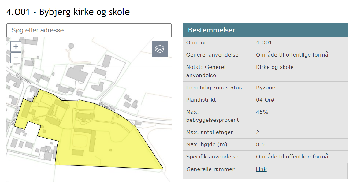 Lokalplanområdet er beliggende i kommuneplanramme 4.O01 som udlægger området til offentlig formål i form af kirke og skole. O - rammer er jf. kommuneplanens generelle rammer offentlige områder, som skal anvendes til offentlige formål som f.eks. være offentlig administration, service-, sundheds-, eller kulturfaciliteter, skoler, idrætsanlæg, institutioner, kirkegårde m.v. Der kan ikke placeres boliger i O - rammer og der vil derfor blive udarbejdet et mindre kommuneplantillæg, hvor den eksisterende rammetekst suppleres med, at der indenfor rammen kan være en bolig i tilknytning til kirken.